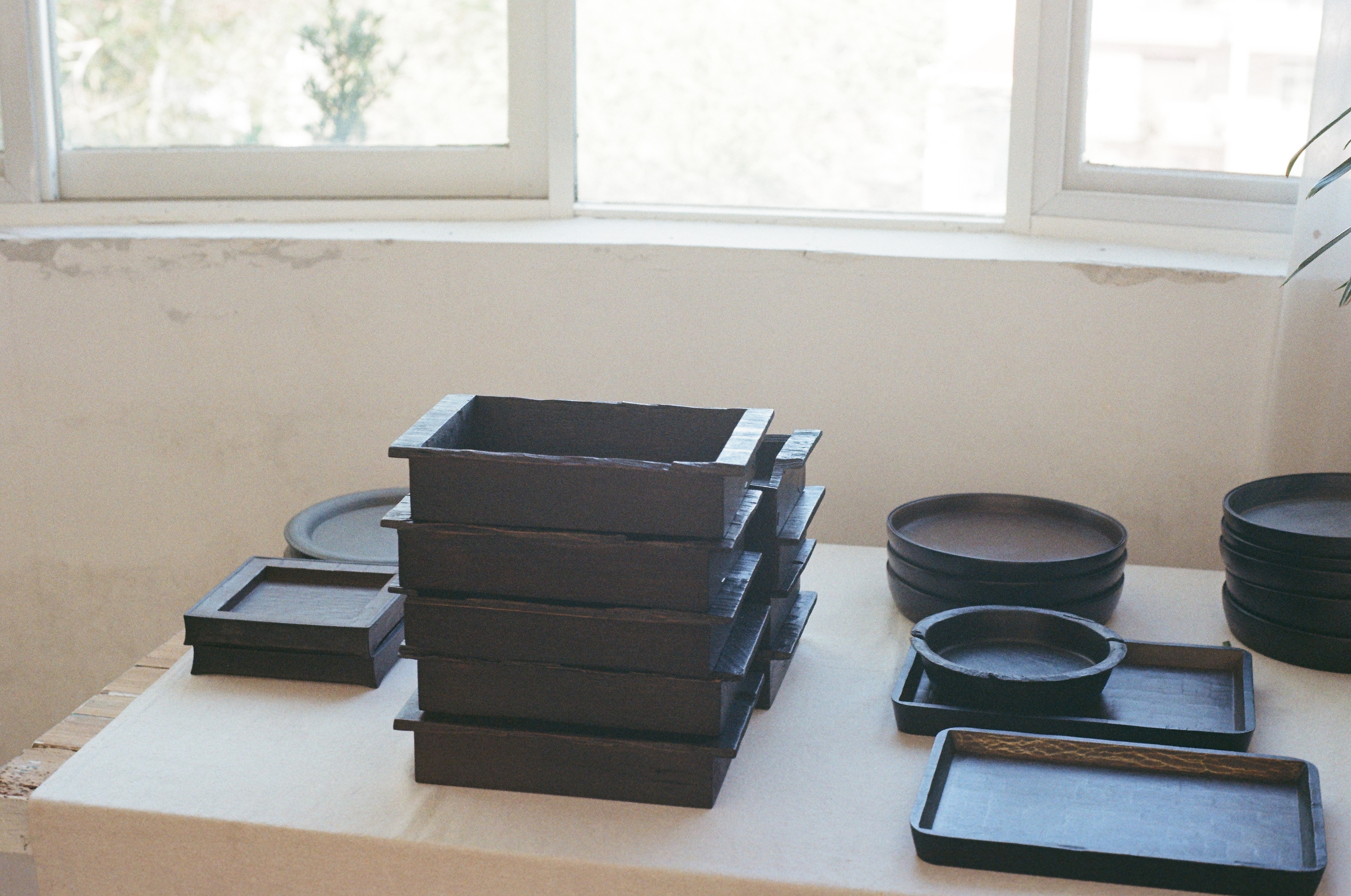 Lacquer is a material of contradiction, strong yet yielding, requiring humidity to cure and applied entirely by hand, while remaining physically demanding to work with. Through repeated cycles of grounding, wiping, polishing, ash application, paper and cloth lining, and sanding, Donghai experiments with material and color, not in pursuit of flawlessness, but through measured control. Emotion is conveyed through restraint.