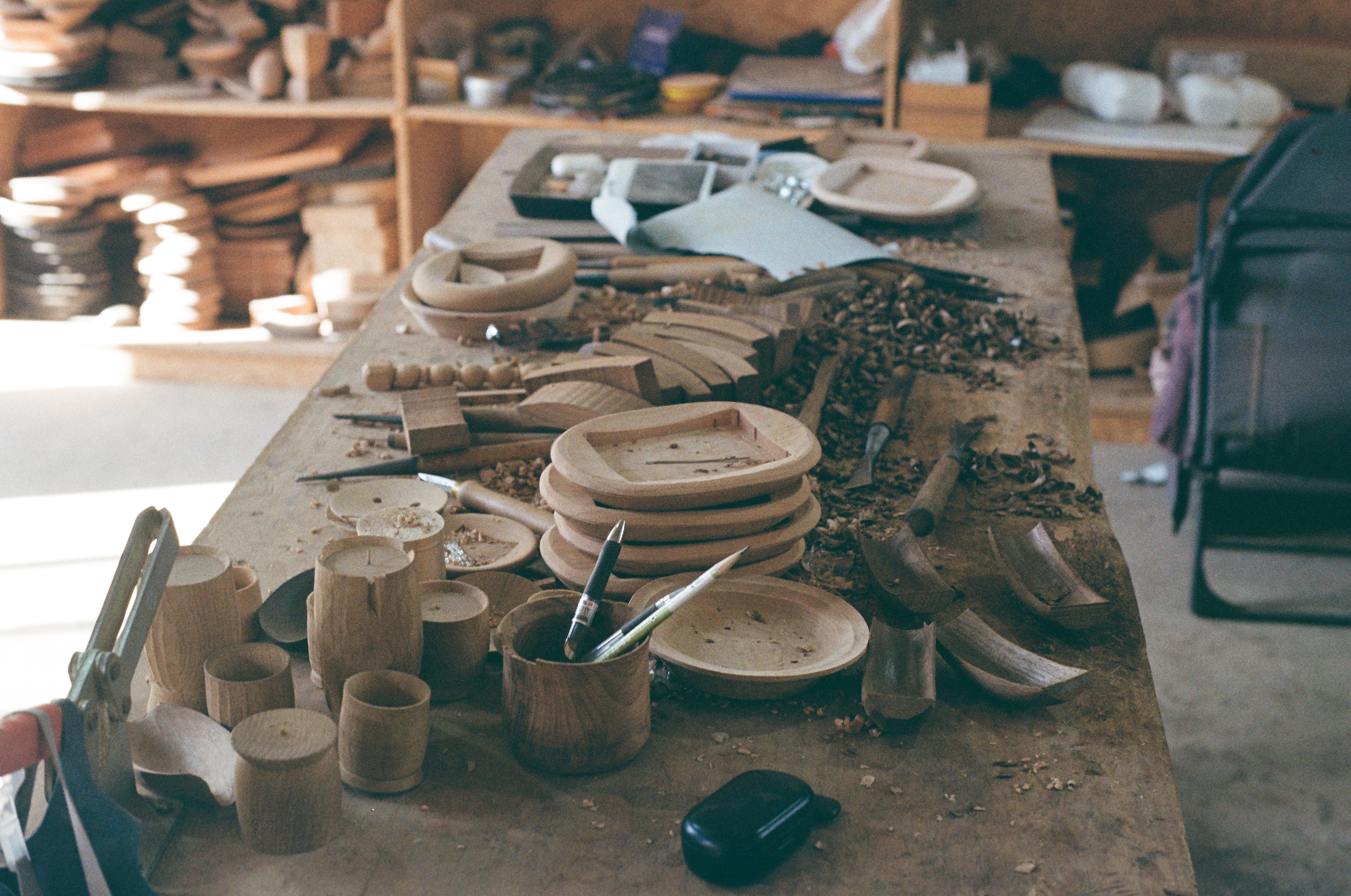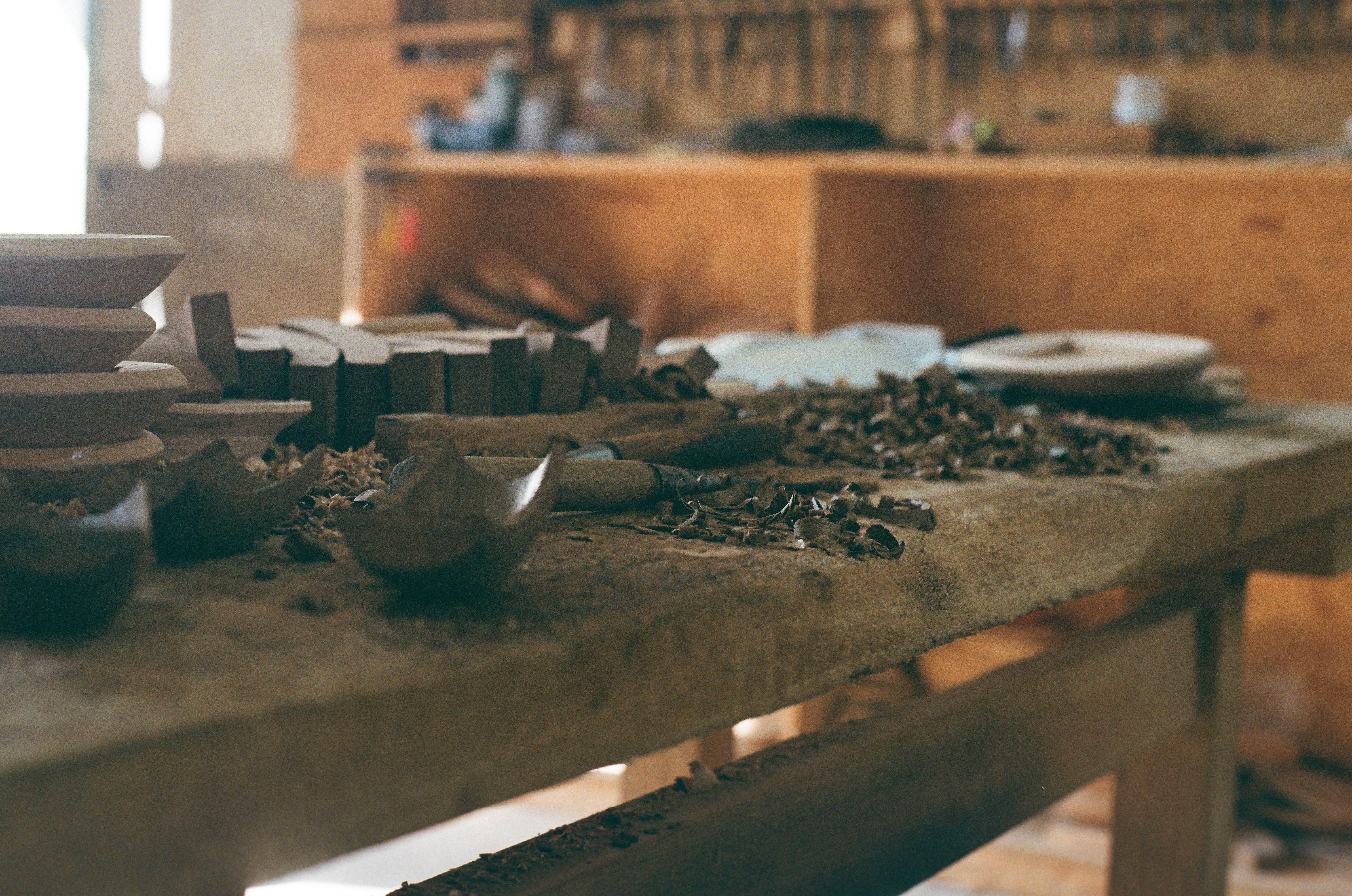Even during the height of the summer rainy season, the workshop carries a dry, steady atmosphere, shaped by stacked timber and partially formed blanks absorbing moisture from the air. Here, people and materials coexist in balance, moving forward in rhythm with the cycles of nature.