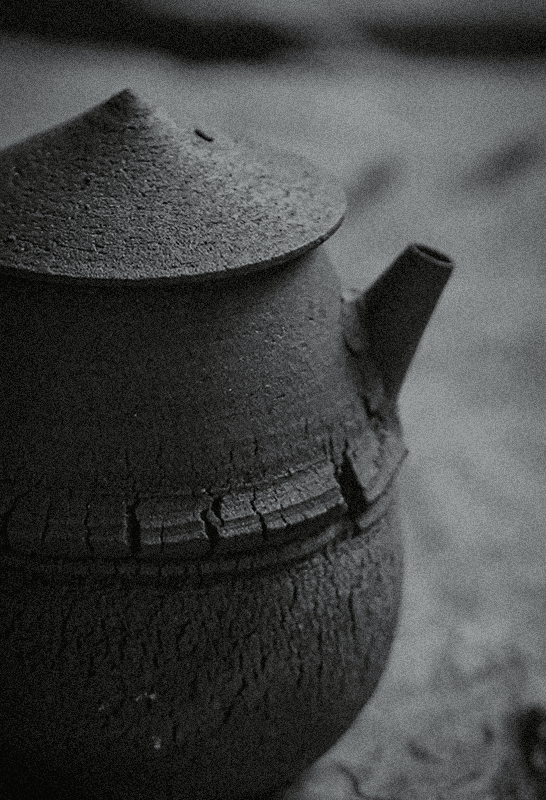 The clay is iron rich and heavily reduced, producing a dark, matte surface with pronounced texture and natural variation. Fine cracks, firing marks, and subtle irregularities remain visible, expressing the transformation of clay through high heat rather than masking it. This material is valued for its strong thermal stability and its ability to soften the profile of tea, rounding edges and deepening body over successive infusions. As the clay absorbs aroma and moisture, the surface slowly darkens and gains depth, reflecting accumulated use.